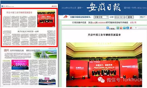 2月1日,《安徽日報》在專版報道:《聯(lián)手打造叉車租賃品牌》。全文如下: